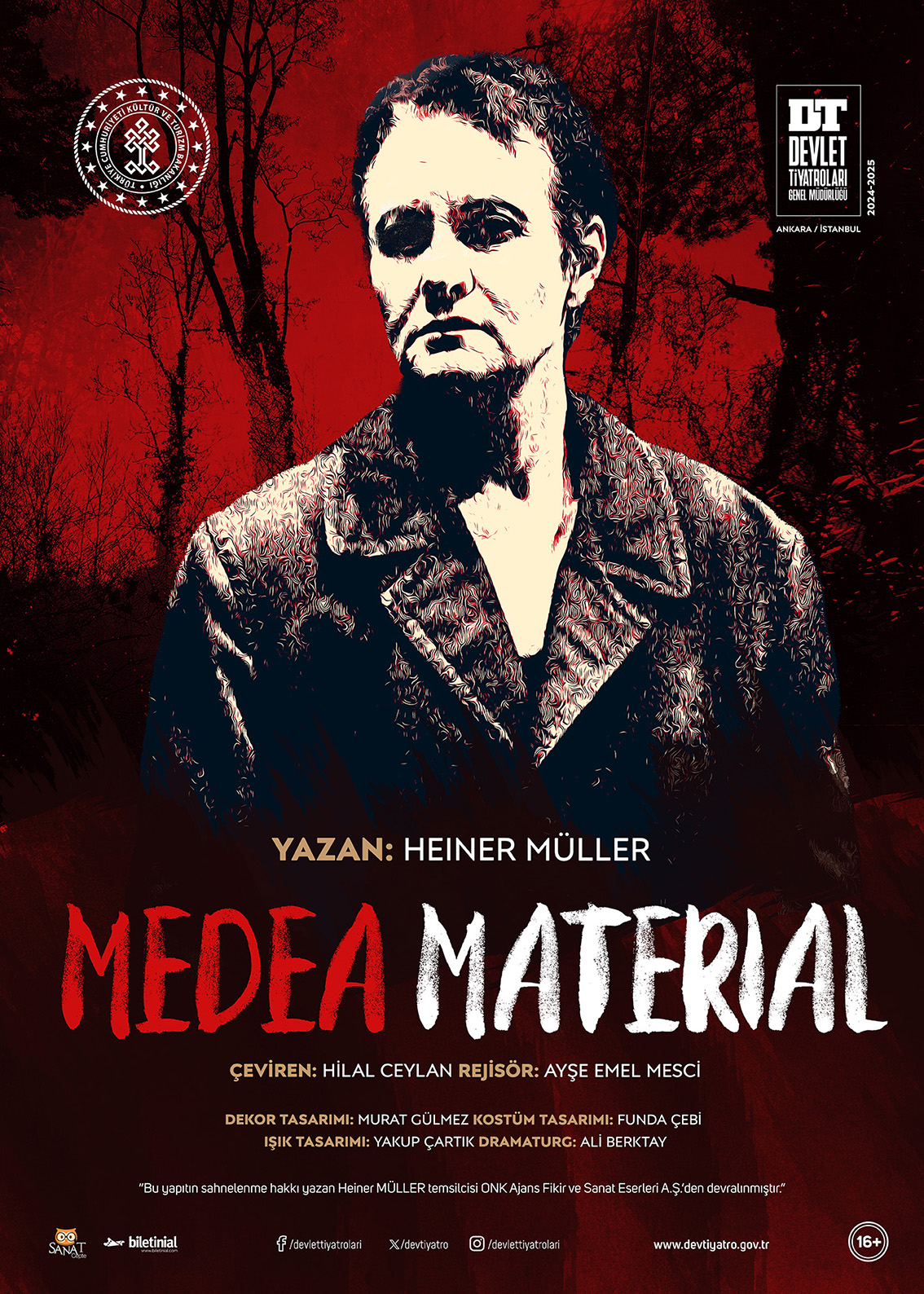 DT’nin resmi sitesindeki “oyunun konusu” da şöyle yazılmış -konu dışında birçok şey söylenerek-: “Mitoloji ve tarihin, anılar ve rüyaların iç içe geçtiği şiirsel bir duvar halısı Brecht ve Robert Wilson gibi ünlü sanatçılarla iş birliğiyle tanınan Heiner Müller, çeşitli disiplinlerdeki yaratıcılara ilham verdi ve hem Almanya’da hem de dünya çapında postmodern avangard tiyatronun önde gelen isimlerinden biri olarak kabul ediliyor. 1982 tarihli oyunu Medea-Material, Ankara ve İstanbul Devlet Tiyatrosu arasındaki bir iş birliğiyle ilk kez Türkçe olarak sahneleniyor.”
